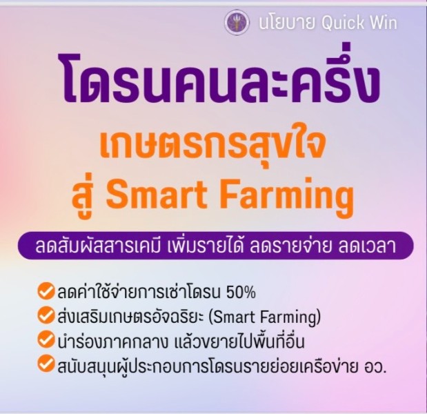 รมว.กระทรวง อว. กล่าวต่อว่า อีกนโยบายเร่งด่วน คือ การช่วยเหลือภาคเกษตรกรรม ซึ่งเป็นคนส่วนใหญ่ของประเทศ โดยกระทรวง อว. จะทำโครงการ “โดรนเพื่อการเกษตรคนละครึ่ง” เป็นการนำเอาวิทยาศาสตร์ วิจัยและนวัตกรรมไปรับใช้ประชาชน ไปรับใช้สังคม โครงการนี้จะช่วยให้เกษตรให้มีคุณภาพชีวิตที่ดีขึ้น ลดการสัมผัสสารเคมี รวมทั้งเพิ่มรายได้ ลดรายจ่าย ประหยัดเวลาและแรงงาน โดยมีรูปแบบของนโยบายเป็นการช่วยค่าบริการหรือค่าใช้จ่ายในการใช้บริการโดรนเพื่อการเกษตรคนละครึ่ง ถือเป็นการใช้เทคโนโลยีและนวัตกรรมมาแก้จนอย่างเป็นรูปธรรมและสอดคล้องกับนโยบายของรัฐบาล ส่งเสริมเกษตรกรให้มีคุณภาพชีวิตและความเป็นอยู่ที่ดีขึ้น เพื่อเปลี่ยนเกษตรแบบดั้งเดิมให้เป็นเกษตรอัจฉริยะ (Smart Farming)โดยจะนำร่องในพื้นที่ภาคกลางเป็นอันดับแรกก่อนจะขยายไปในพื้นที่อื่น ขณะเดียวกัน เราจะดึงเครือข่ายผู้ประกอบการ SMEs และสตาร์ทอัพด้านโดรนเพื่อการเกษตร ซึ่งเข้าร่วมโครงการกับอุทยานวิทยาศาสตร์ภูมิภาคมาเป็นผู้ให้บริการเช่าโดรน นอกจากนี้ ยังเปิดโอกาสให้ผู้ประกอบการด้านให้บริการโดรนเพื่อการเกษตรรายย่อยอื่นๆ มาสามารถมาเข้าร่วมโครงการนี้ได้ ซึ่งจะเป็นการเพิ่มรายได้ให้กับผู้ประกอบการในอุตสาหกรรมได้อีกด้วย